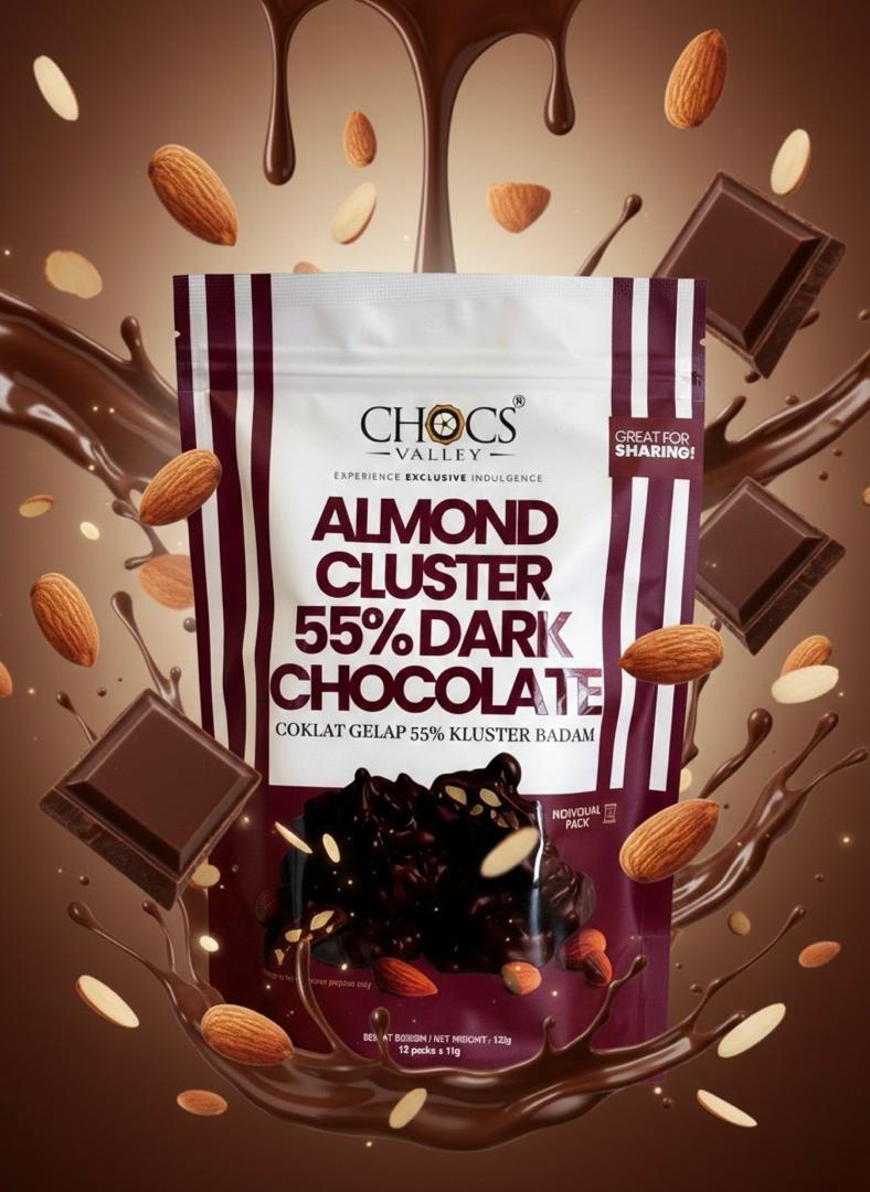 ALMOND CLUSTER 55% DARK CHOCOLATE POUCH @ 12 PACKS